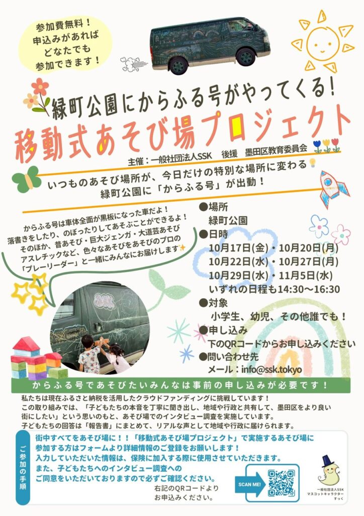緑町公園に「移動式あそび場 からふる号」がやってきます!日程:10月17日(金)・10月20日(月)・10月22日(水)・10月27日(月)・10月29日(水)・11月5日(水)時間:14:30〜16:30参加にあたり、以下の詳細情報のご登...